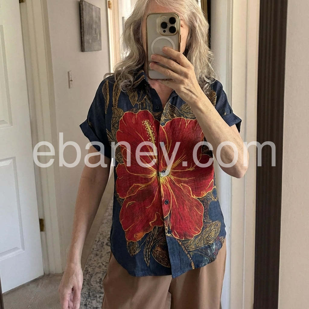 Style# 1544311Channel island vibes with this Bold Tropical Hibiscus Print Top, a vibrant statement piece that brings the essence of paradise to your wardrobe. Crafted from lightweight, breathable fabric—likely cotton or linen blend—it features a rich navy base adorned with a striking oversized red hibiscus flower outlined in golden yellow, complemented by intricate leafy patterns throughout. The classic short-sleeve shirt design includes a relaxed fit, button-down front, and rolled sleeves for an effortless, laid-back look. Perfect for pairing with denim jeans, high-waisted shorts, or flowy skirts, this top is ideal for beach days, tropical getaways, or summer city strolls. Its bold floral motif exudes bohemian charm and exotic flair, making it a standout choice for those who love fashion with personality. Inspired by the playful, romantic styles found on sites like Lulus, this shirt effortlessly blends artistry and comfort—ideal for adding a splash of color and confidence to your warm-weather wardrobe.