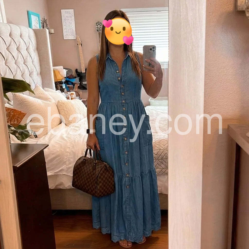Crafted from premium denim, this sleeveless maxi dress combines timeless style with modern versatility. The flattering V-neckline and button-front closure create a refined silhouette that transitions effortlessly from casual daytime wear to evening occasions. The full-length cut offers elegant coverage while the structured denim fabric ensures durability and shape retention. Perfect for layering with jackets or cardigans, this wardrobe essential delivers both comfort and sophisticated appeal.