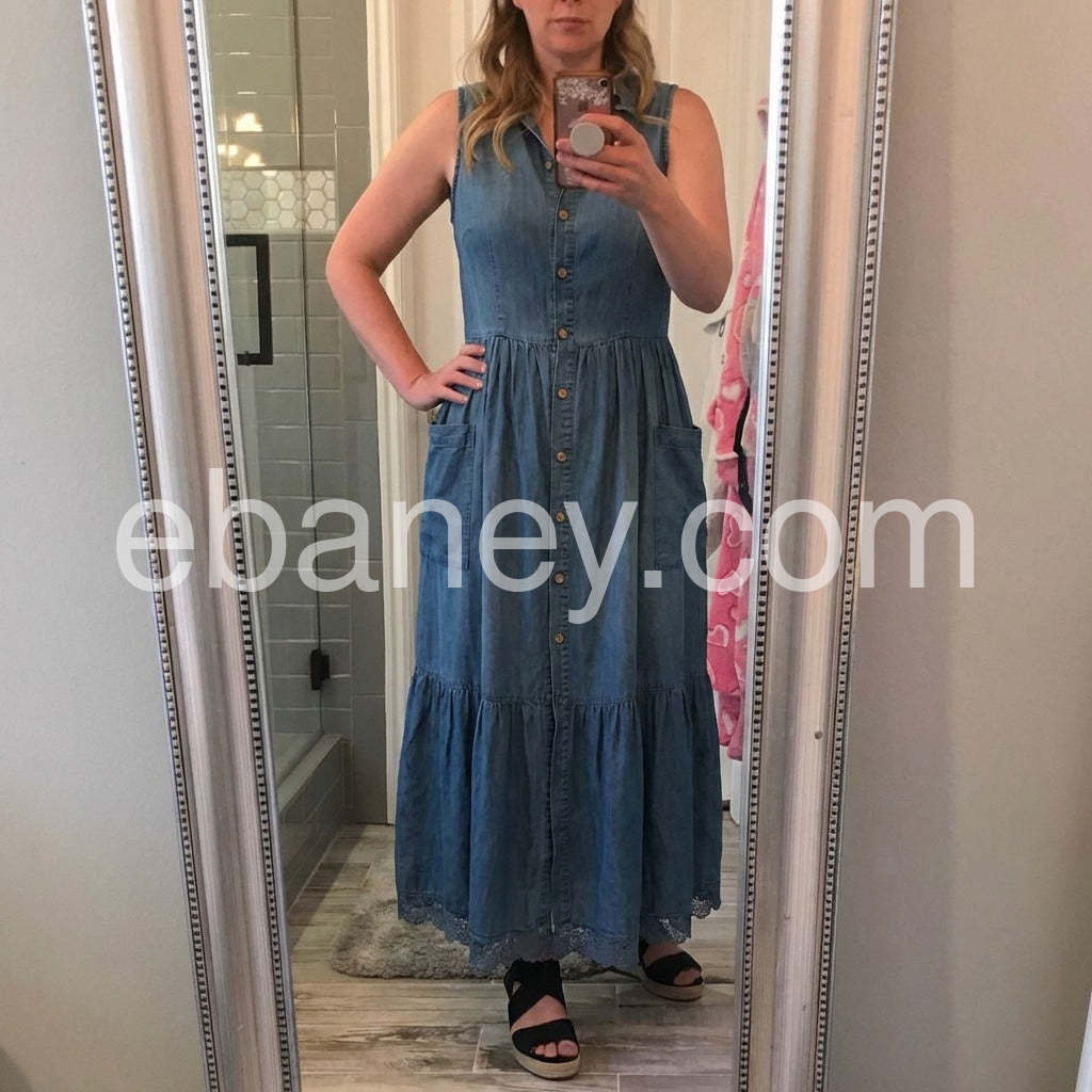 This maxi dress is stunning. The lace detail at the bottom hem adds such a nice feminine touch to the casual chambray style. I wore it on my beach vacation and got so many compliments.