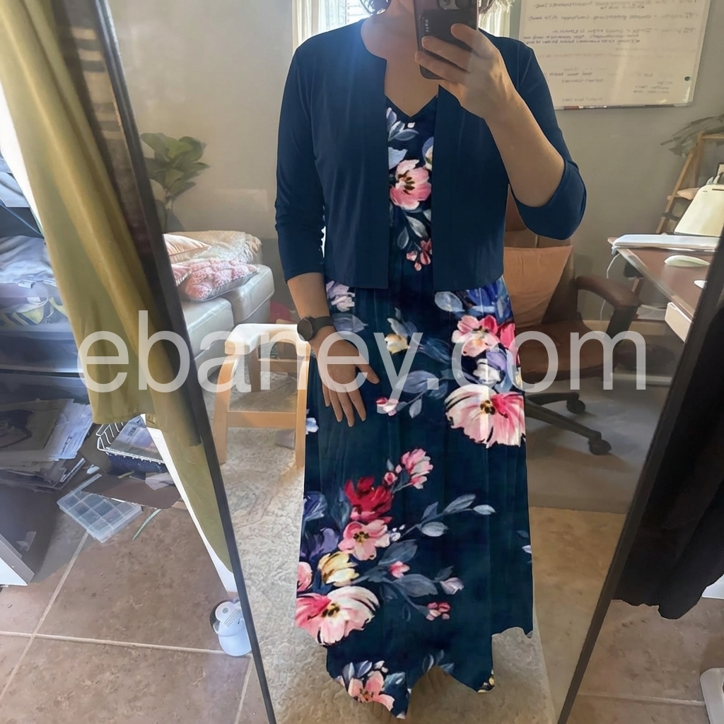 I’m absolutely in love with this dress. So elegant and flattering. The navy base with the vibrant floral print looks rich and eye-catching, and the fit feels just right for everyday wear.