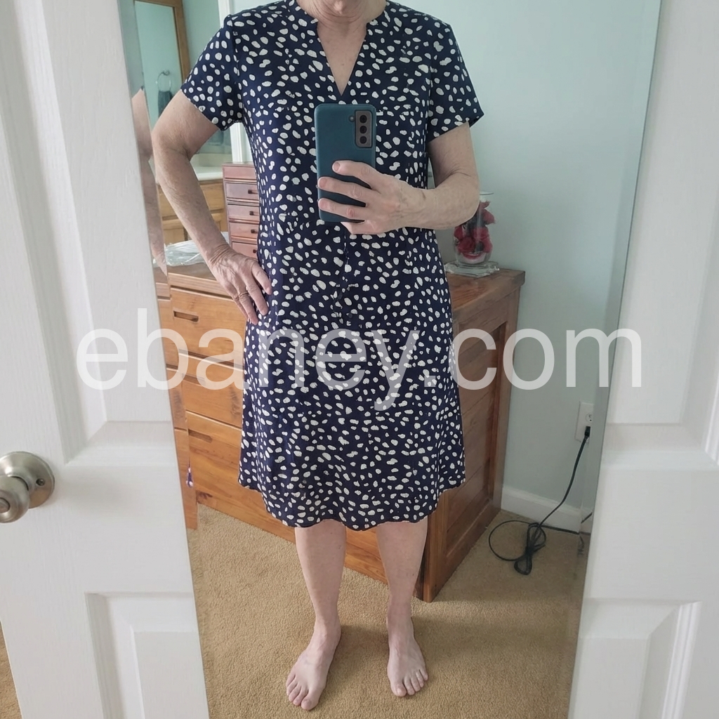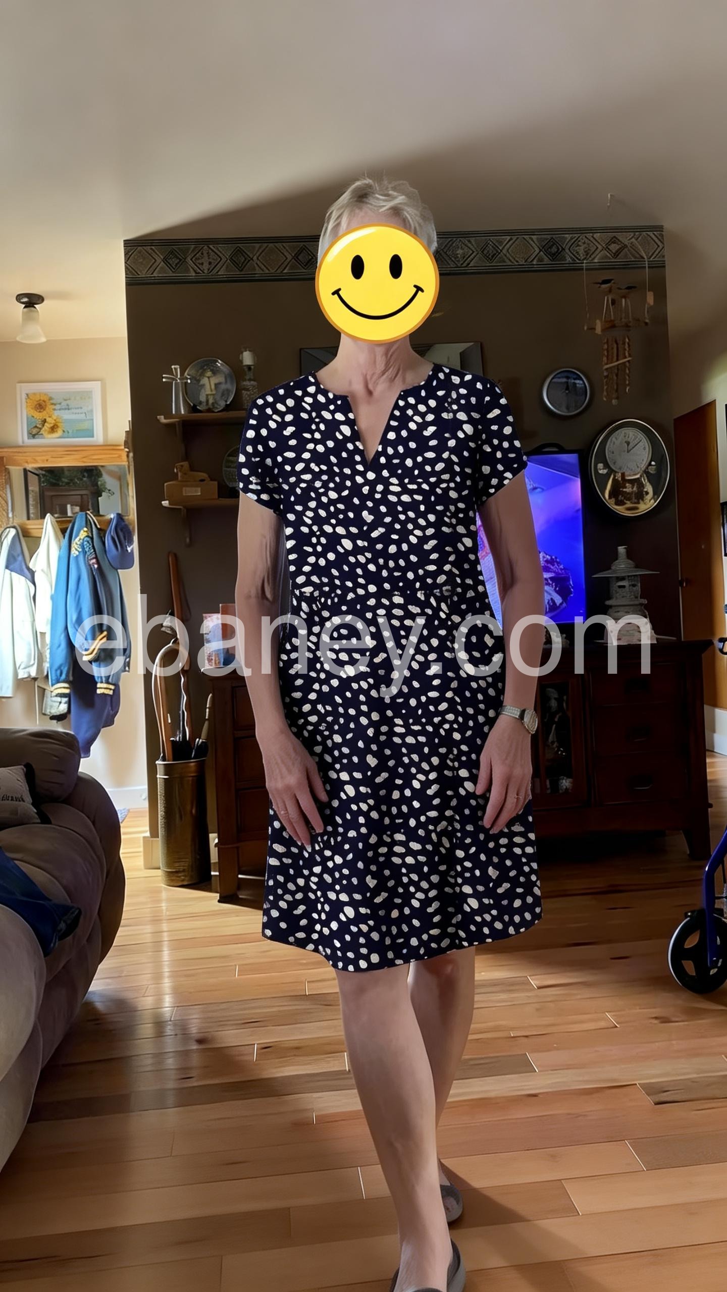 This has quickly become my go-to dress for church and nice lunches. The navy blue with white specks is classic and elegant. It is very flowy and does not cling anywhere. The sizing was spot on based on the chart. Highly recommend if you want something easy to throw on that still looks put together.