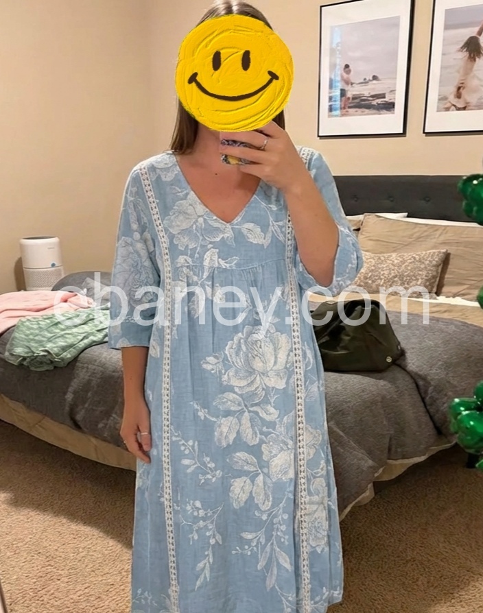 I absolutely love this dress! The light blue color is so pretty for spring, and the white floral pattern gives it a great boho vibe. Best part? It has pockets! The fit is loose and very forgiving, making it incredibly comfortable for all-day wear.