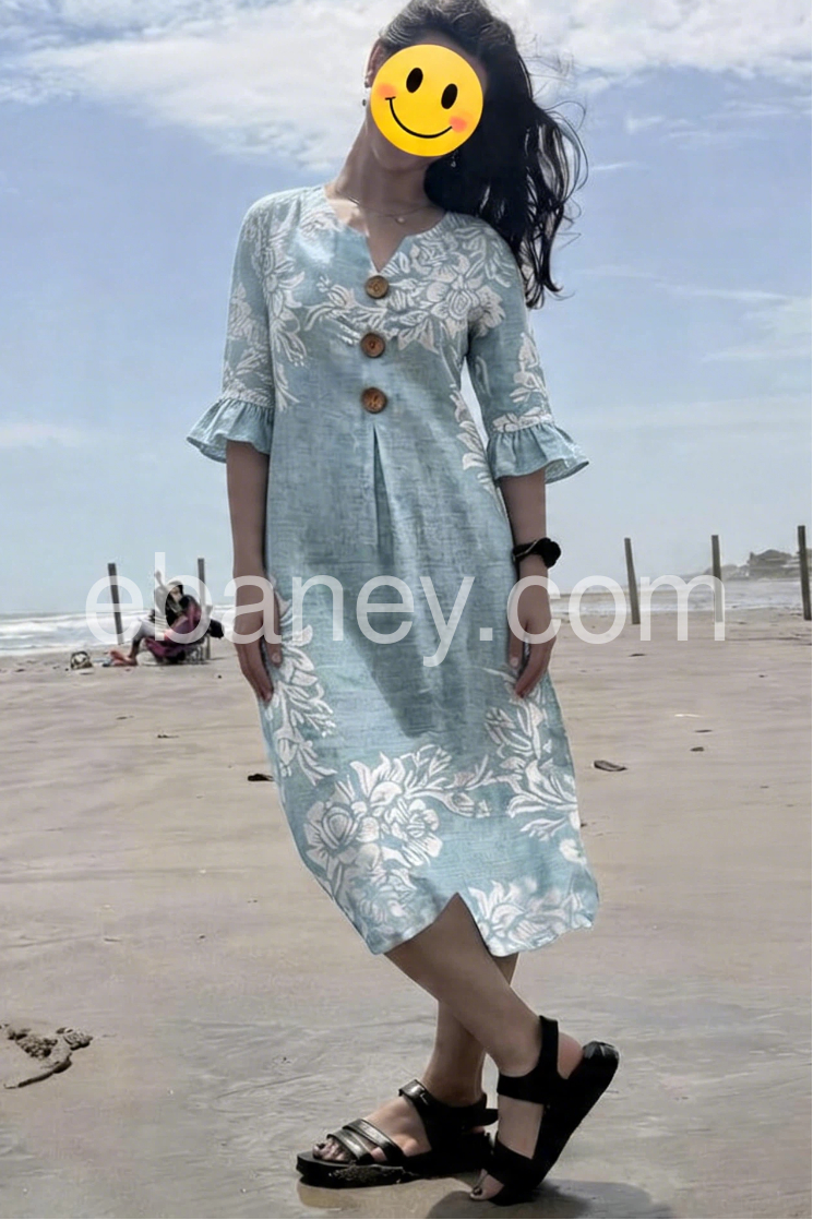 Blue Floral Ruffle Sleeve Button Linen Maxi Dress