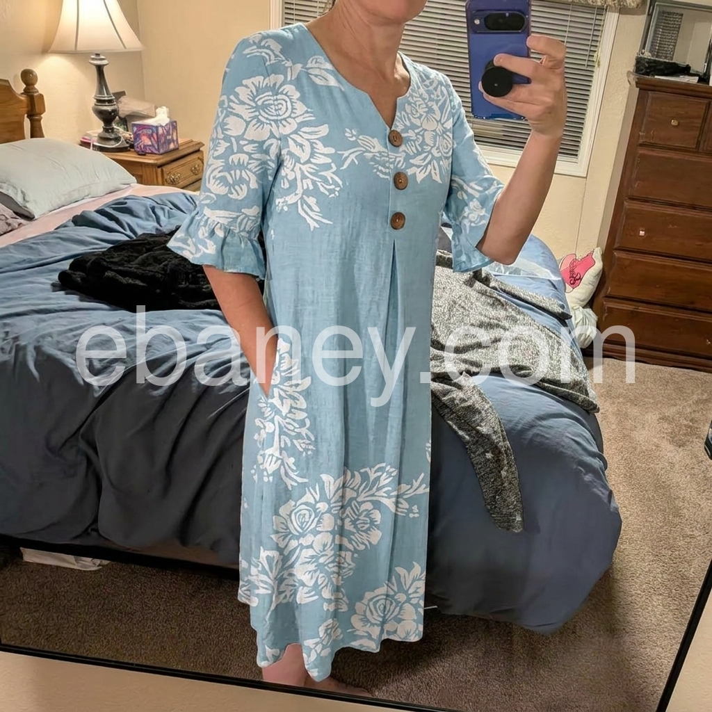Such a great find! The fabric feels like a nice linen blend and doesn't cling to you at all. It is very forgiving around the tummy area while still giving a nice shape thanks to the pleat under the buttons. Perfect for a casual lunch or walking along the beach.