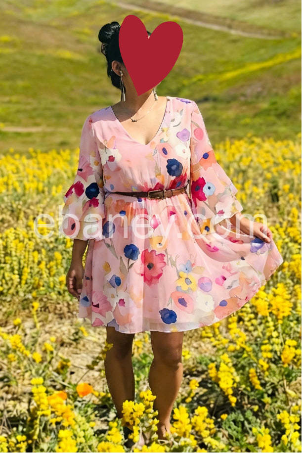 Style# 1544501Embrace soft romance and effortless style in this Pink Watercolor Floral 3/4 Sleeve Mini Dress , a dreamy mini dress that captures the beauty of blooming spring. Crafted from lightweight, flowing fabric—likely chiffon or rayon blend—this dress features a delicate watercolor-inspired floral print in vibrant shades of pink, coral, navy, yellow, and white, creating a painterly effect across the soft blush base. The flattering V-neckline adds a touch of elegance, while the short ruffle sleeves bring playful volume and feminine charm. A relaxed, A-line silhouette ensures comfort and ease, making it perfect for casual days, brunches, or warm-weather outings. Paired here with layered bracelets and a pearl necklace, it exudes boho-chic appeal. Ideal for beach trips, garden parties, or weekend strolls, this dress brings a sense of lightness, joy, and timeless femininity to your wardrobe. Let this floral mini dress turn every moment into a gentle celebration of color and style.