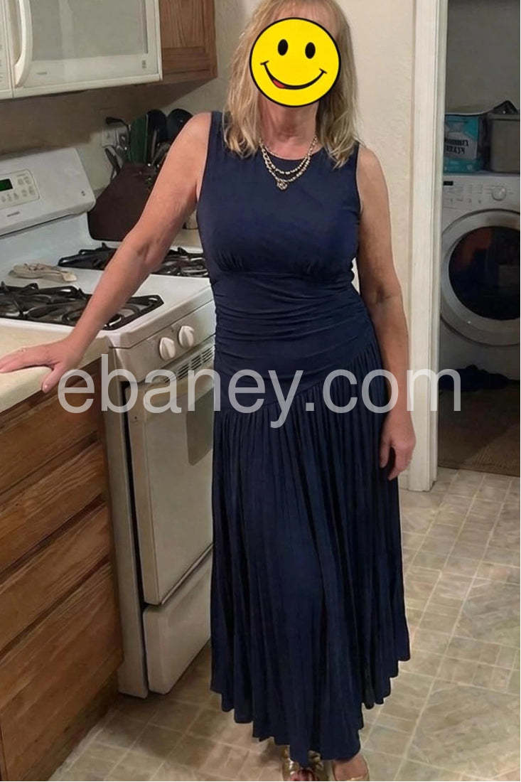 This stunning navy blue midi dress embodies timeless elegance with its sleek, figure-flattering silhouette. Crafted from luxurious, fluid fabric—likely satin or crepe—it features a sleeveless design with a round neckline and a beautifully ruched waist that accentuates the natural curves. The skirt flows gracefully into a layered, pleated A-line hem that adds movement and drama with every step. Perfect for formal events, cocktail parties, or upscale evening outings, this dress combines simplicity with refined detail. Paired with strappy heels, delicate jewelry, and a structured handbag, it creates a polished look that radiates confidence and grace. Its rich navy hue makes it versatile enough to wear year-round, while the elegant drape ensures comfort and style in equal measure. A must-have for any woman who appreciates classic, sophisticated fashion with a touch of modern flair.