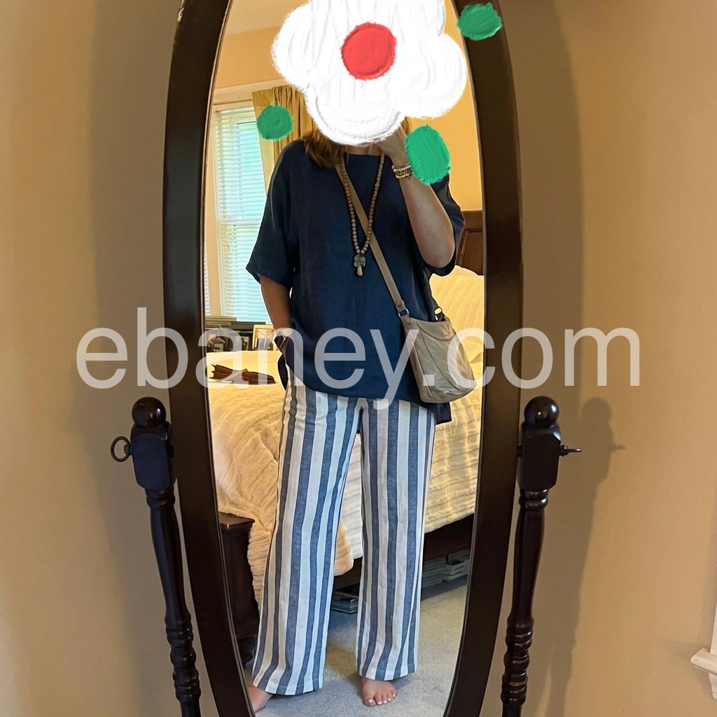 So comfy and chic. The dark blue tunic top drapes beautifully over the striped pants. It feels like wearing pajamas but looks put together enough for lunch with friends or running errands.