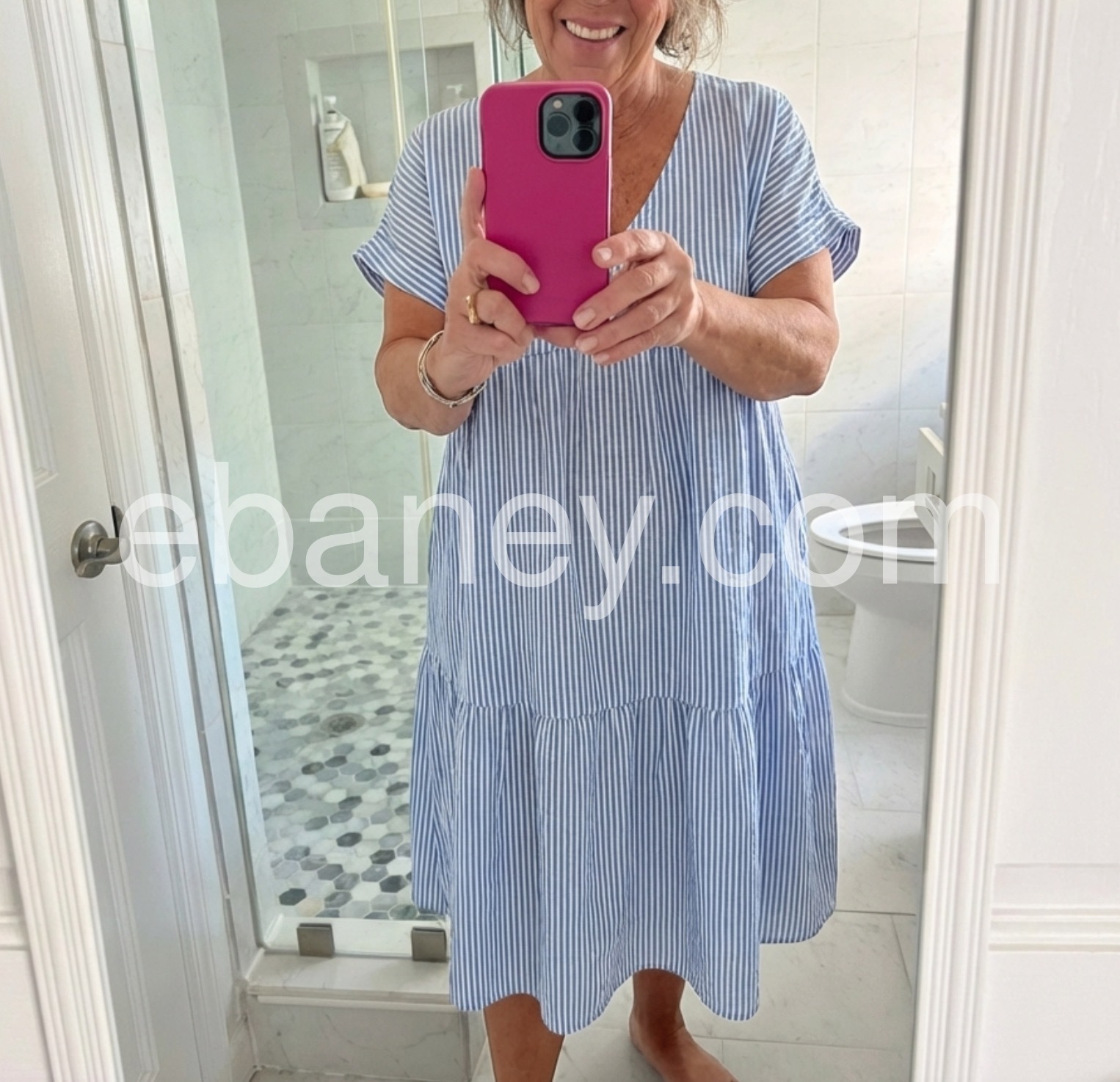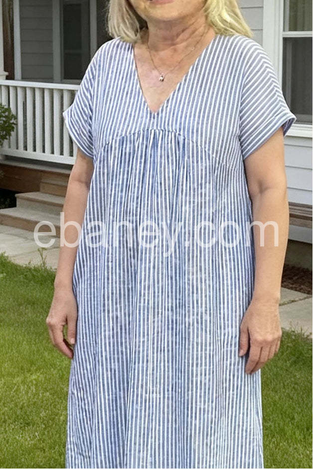 I bought this dress last week and I'm absolutely in love with how airy it feels. The light blue and white stripes look even better in person, and the V-neck is flattering without being too deep. It is the perfect summer casual dress.