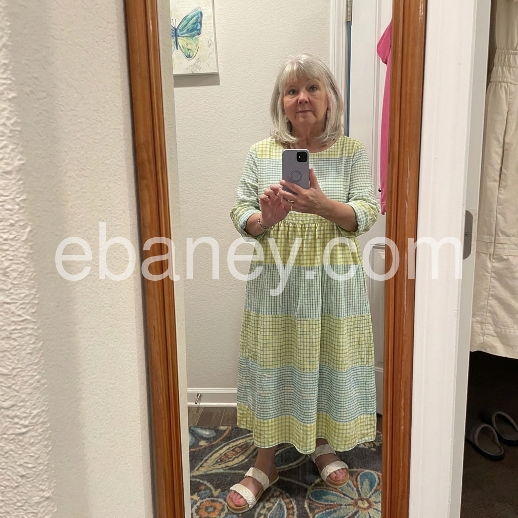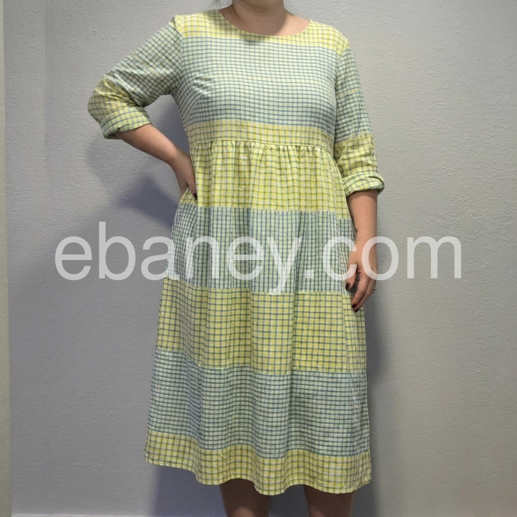 Beautiful pastel colors! The yellow and blue check is so cheerful for spring. It hits right at my ankles and the rolled sleeves give it a nice casual touch.