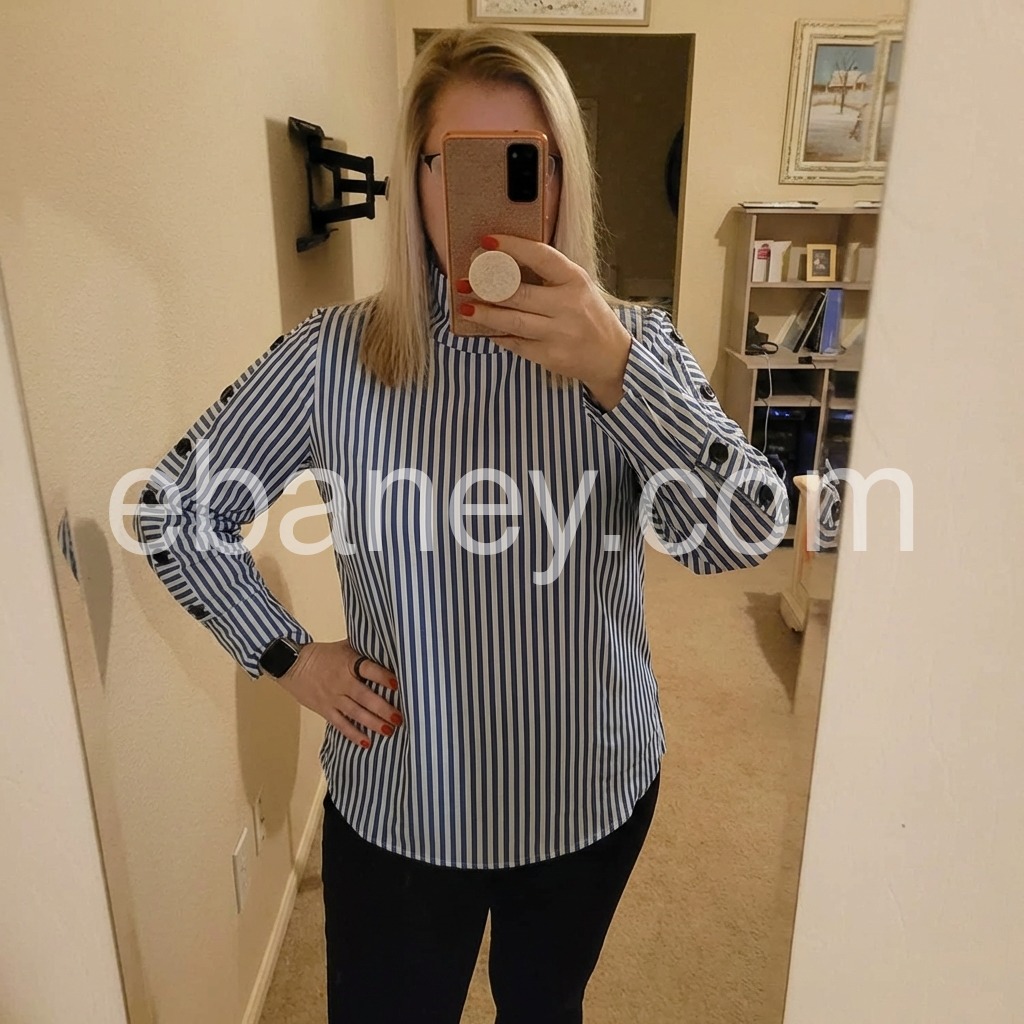 Love the blue and white stripes! It looks so professional for work but is comfortable enough for all-day wear. The button details on the sleeves add a really nice touch.
