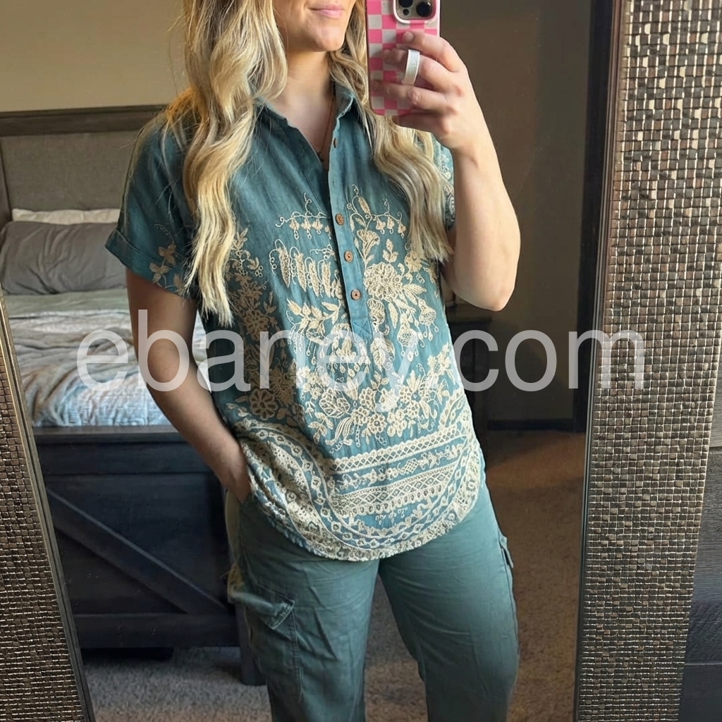 This blouse is a wearable work of bohemian art. The rich teal base, adorned with intricate cream floral and border embroidery, makes a striking statement.