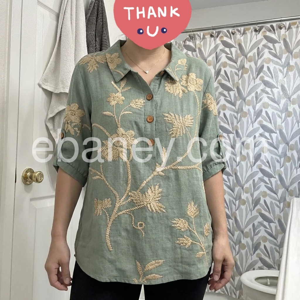 I absolutely love this blouse! The floral embroidery is gorgeous and adds such a nice texture to the top. The sage green color is exactly as pictured. It fits true to size and the linen-like material is perfect for warm weather. Highly recommend!