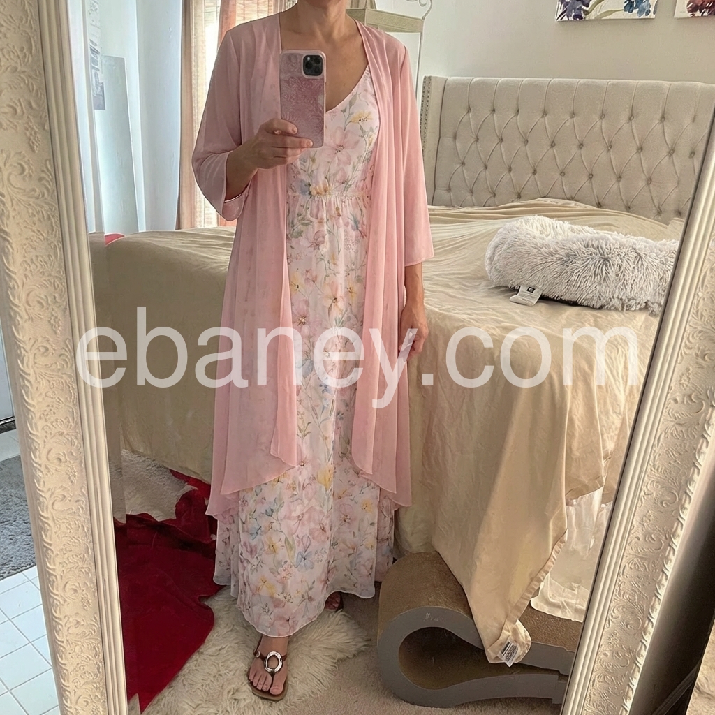 I bought this beautiful two piece set for a spring wedding and it was absolutely perfect. The floral pattern is delicate and feminine, and the sheer pink duster adds just the right amount of elegance and arm coverage. It fits true to size and flows beautifully when I walk. I received so many compliments!