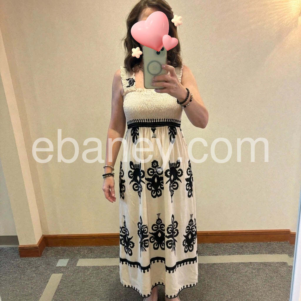 Gorgeous dress with beautiful detailing. The black embroidery stands out nicely against the cream background, and the smocked top provides a secure, comfortable fit. The length is perfect for both everyday wear and special occasions. Packaging was neat and delivery was quick.