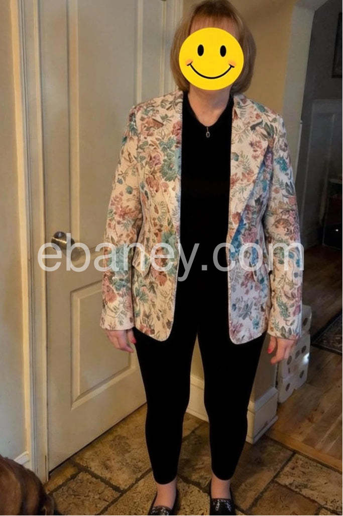 Style# 1544006This exquisite floral blazer redefines modern elegance with its delicate pastel-toned botanical print, featuring soft pink roses, mint green leaves, and subtle hints of blue and coral on a creamy white base. Crafted from lightweight, structured fabric—likely wool blend or crepe—it offers a tailored fit with clean lines and classic notched lapels, blending sophistication with romantic charm. The single-breasted design adds a polished touch, while the long sleeves and slightly cropped silhouette enhance its flattering shape. Paired with a silky slip dress and a neutral handbag, it creates a stunning contrast between feminine flair and refined tailoring. Perfect for spring weddings, garden parties, or upscale brunches, this blazer effortlessly elevates any outfit with its artistic pattern and luxurious feel. A statement piece that merges fashion-forward design with timeless grace—ideal for those who love to express romance and confidence in their style.