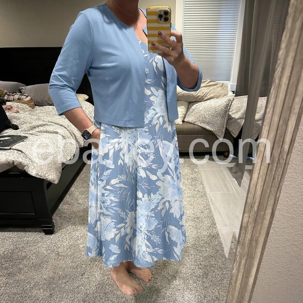 This dress features a flowing midi length with soft blue floral print. Paired with a matching short sleeve jacket for a polished look. V-neckline and side pockets add comfort and style. Lightweight fabric perfect for warm days. Ideal for casual outings or garden events.