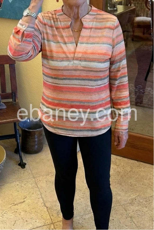 Style# 1544291Add a touch of effortless charm to your wardrobe with this Soft Striped Long Sleeve Top, a cozy yet stylish piece that blends comfort and fashion. Crafted from lightweight, textured fabric—likely a cotton or linen blend—this top features a vibrant horizontal stripe pattern in warm, earthy tones including coral, peach, dusty rose, gray, and soft blue, creating a soothing, sunset-inspired palette. The relaxed fit and slightly oversized silhouette offer a laid-back, modern feel, while the split neckline adds a subtle hint of elegance and visual interest. The long sleeves can be rolled up for a casual look or left down for a more polished vibe. Perfectly paired with jeans, denim shorts, or high-waisted skirts, this top is ideal for weekend outings, coffee dates, or casual office wear. Inspired by the curated, boho-chic styles found on Lulus.com, it brings a sense of warmth and artistic flair to any outfit. A versatile staple that effortlessly elevates everyday looks with its soft texture and colorful design—ideal for those who love comfortable fashion with a creative edge.