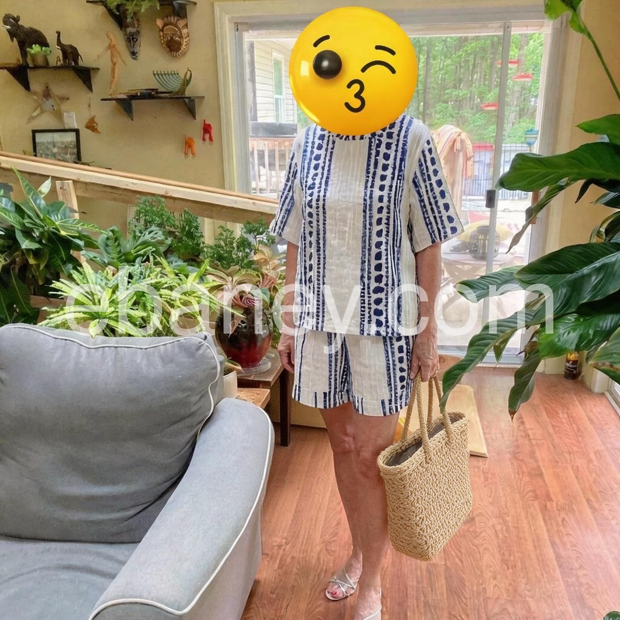 This matching set is absolutely delightful. The white and blue stripes look fresh and crisp, and the fabric feels light and breathableerfect for warm days. The fit is true to size, and the relaxed short silhouette is flattering and comfortable. The straw bag adds a perfect, tropical touch that ties the whole look together. Customer service was responsive, and delivery was quick, making the shopping experience smooth from start to finish. Highly recommend for a chic, effortless summer outfit.