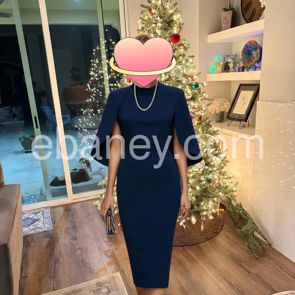 I absolutely love this dress! The navy color is elegant and the fit is very flattering. The cape flared sleeve style adds a refined touch and makes it look dressy without being uncomfortable. I also like the clean neckline and the way the waist is shaped. It feels like good quality and looks exactly as pictured—perfect for holiday events and special occasions.