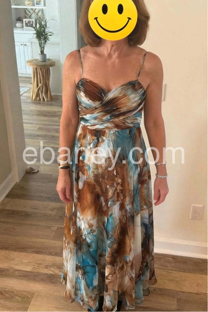 Style# 1544026This breathtaking maxi dress is a wearable piece of art, featuring a stunning abstract watercolor print in rich tones of teal, rust, brown, and cream. Crafted from lightweight, flowing fabric—likely chiffon or silk blend—it drapes gracefully, creating an ethereal silhouette that moves with every step. The spaghetti straps and sweetheart neckline accentuate the décolletage, while the fitted bodice seamlessly transitions into a flared, ankle-length skirt that adds drama and femininity. The artistic brushstroke design evokes natural elements like ocean waves and autumn leaves, making it perfect for artistic events, evening soirees, or romantic getaways. Paired with strappy heels and minimal jewelry, this dress exudes effortless sophistication. Ideal for those who appreciate bold yet elegant fashion with a touch of creative flair, it’s a statement piece that turns heads and sparks conversation. A true fusion of fashion and fine art.