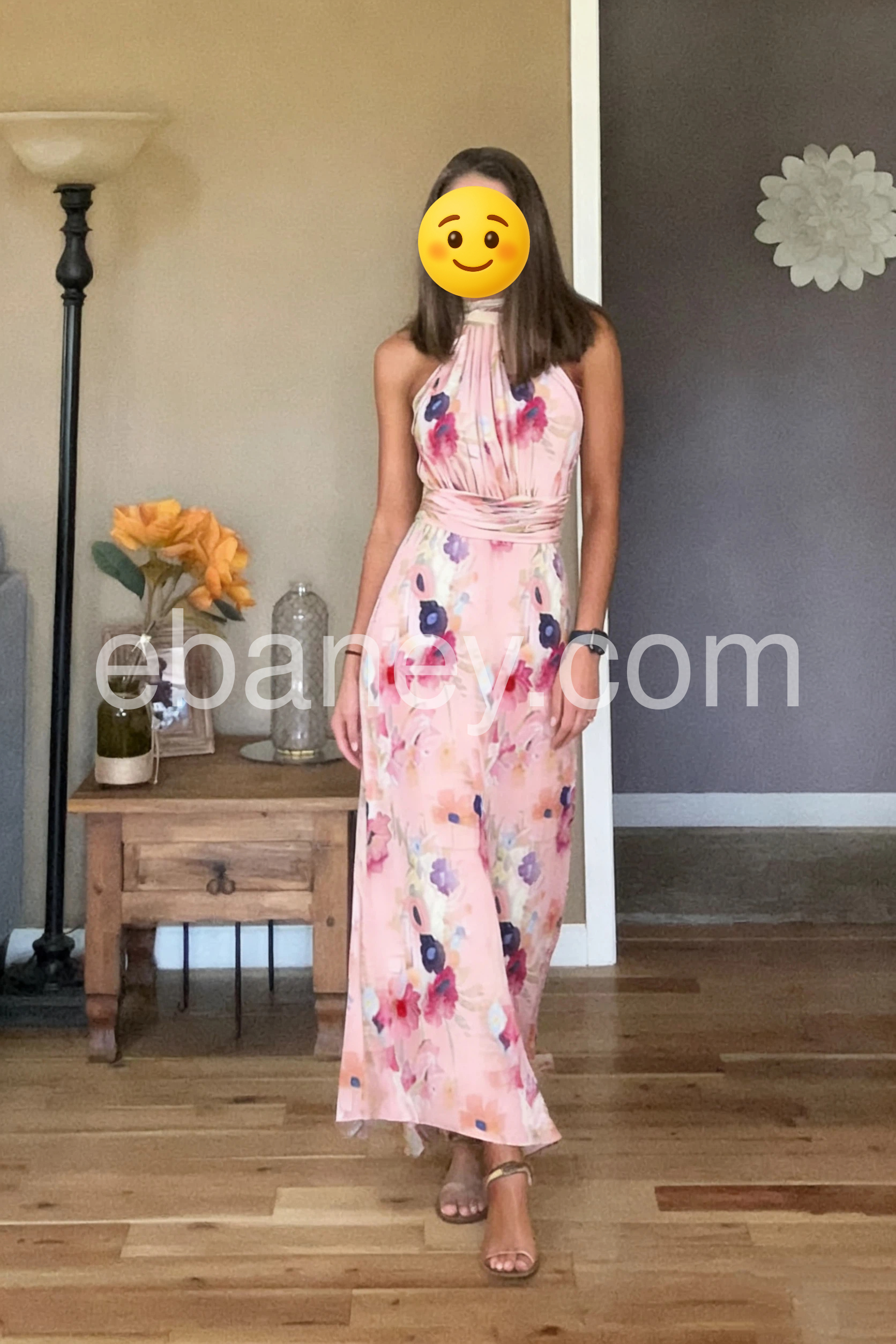 This halter-neck maxi dress features a soft pink base with vibrant floral prints. The ruched neckline and fitted waist highlight the silhouette. Lightweight fabric drapes beautifully for movement. Perfect for formal events or summer soirées. Effortlessly chic and feminine.